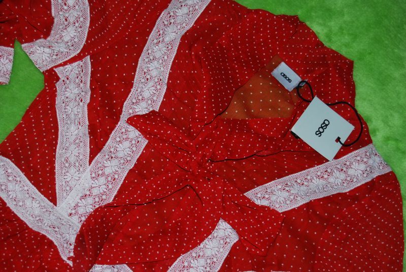 6. nowa śliczna sukieneczka marki ***ASOS***, wkładana przez głowę; dekolt podłużny z wiązaną kokardą; odcinana w talii; dołem rozkloszowana; zapinana z boku na zamek błysk.; materiał transparentny; od spodu sukieneczka na regulowanych ramiączkach; zdobiona delikatną oryginalną kremową koroneczką; nowa z metkami;