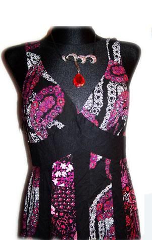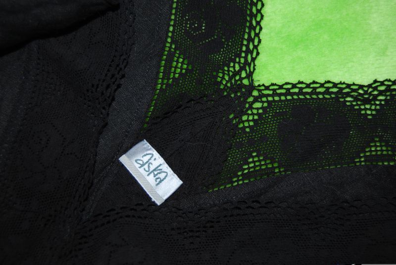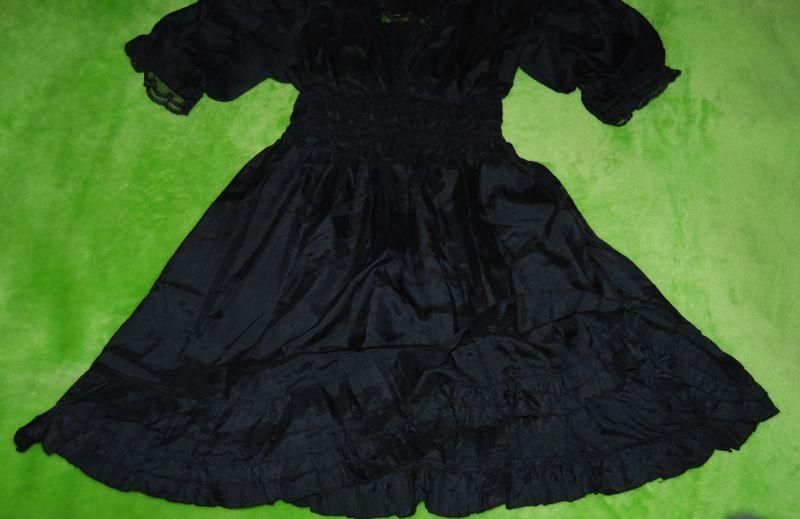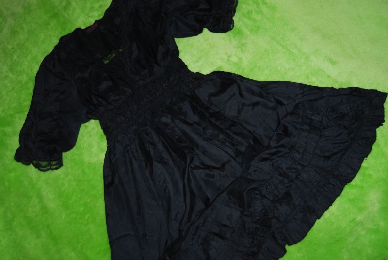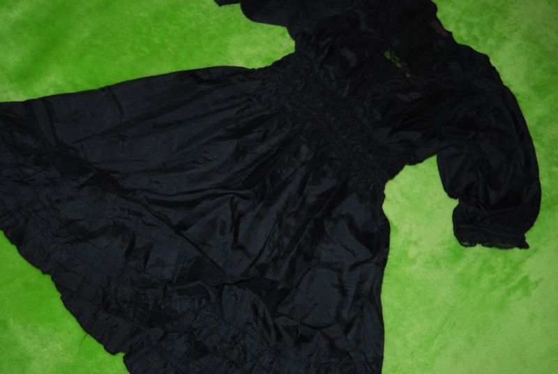 odcinana pod linią biustu, gumka plus koroneczki; dołem rozkloszowana - małe trzy falbaneczki; używana, stan bardzo dobry-; skład: 100% silk;