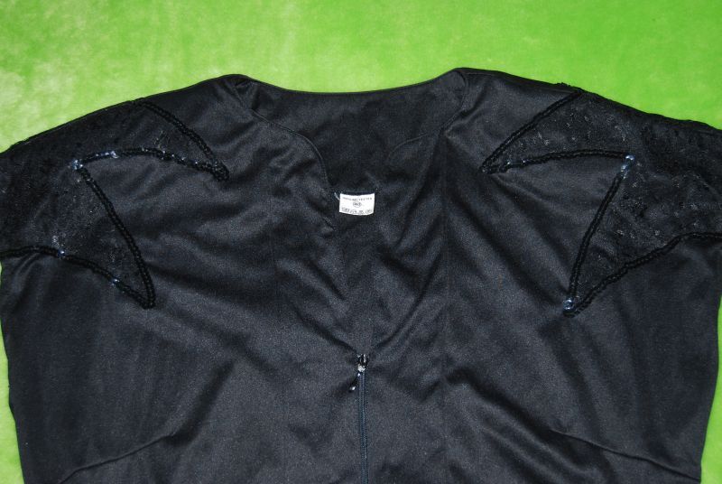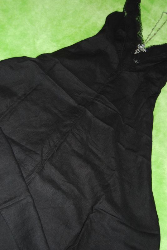 8. maxi czarna sukienka marki: ***ASKA***, wsuwana z zapięciem z boku; dekolt szpic wykończony bawełnianą koronką;