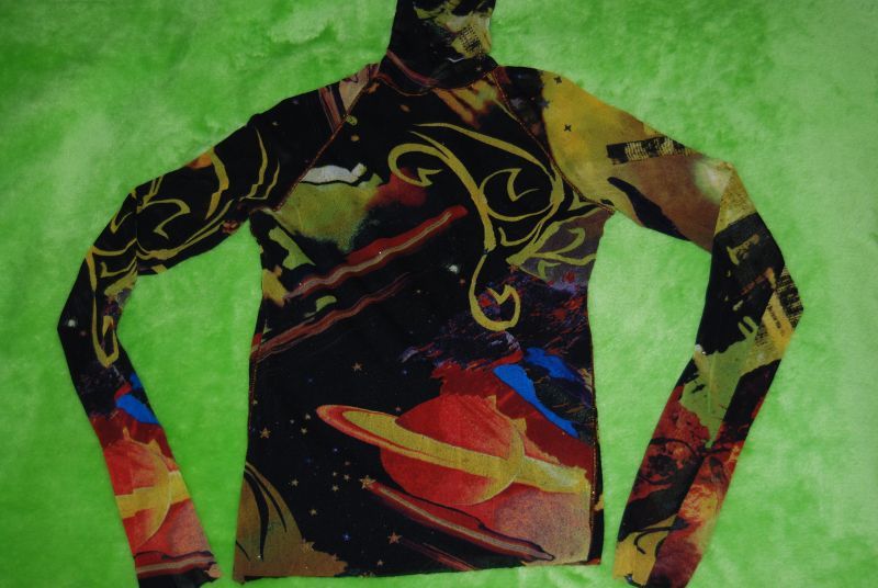 17. kolorowy golf kenzo jeans, wsuwany bez zapięcia; rękawy wszywane reglanowo; całość wykonana z elastycznej siateczki; przód podwójny; stan bardzo dobry; wyjątkowy wzór "galaxy", "space";