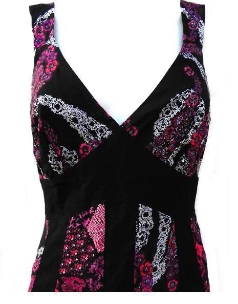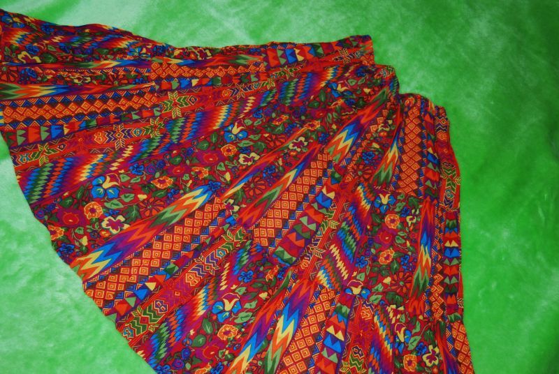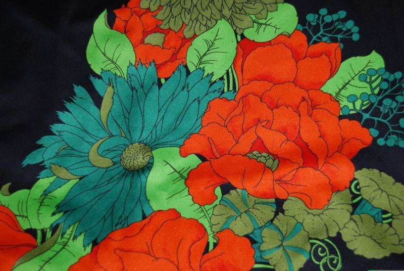 forma trapezu; niesamowita barwa kwiatów; wzór kwiatowy z przodu i z tyłu; stan bardzo dobry-; całość na czarnej podszewce; 100% polyester;